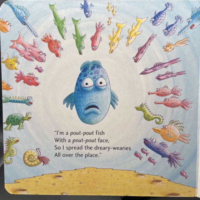 A book about a fish who thinks he’s grumpy, but with the kindness of another fish, realizes he’s a happy fish.