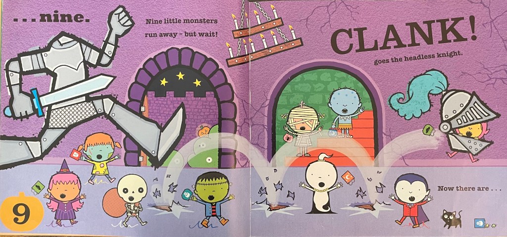 “Ten little monsters waken from their sleep…” and make their way through a castle, but as they do, monsters get separated one by one until there’s only one left. Each page is a new number with a rhyme to the previous number. It’s such a fun way to practice numbers, rhyming and prediction skills since you can guess what number might come next, what the rhyming word is, and what happened to each monster as they get separated. The pictures are loaded with things to talk about and keep kids interested in the story as you’re reading.