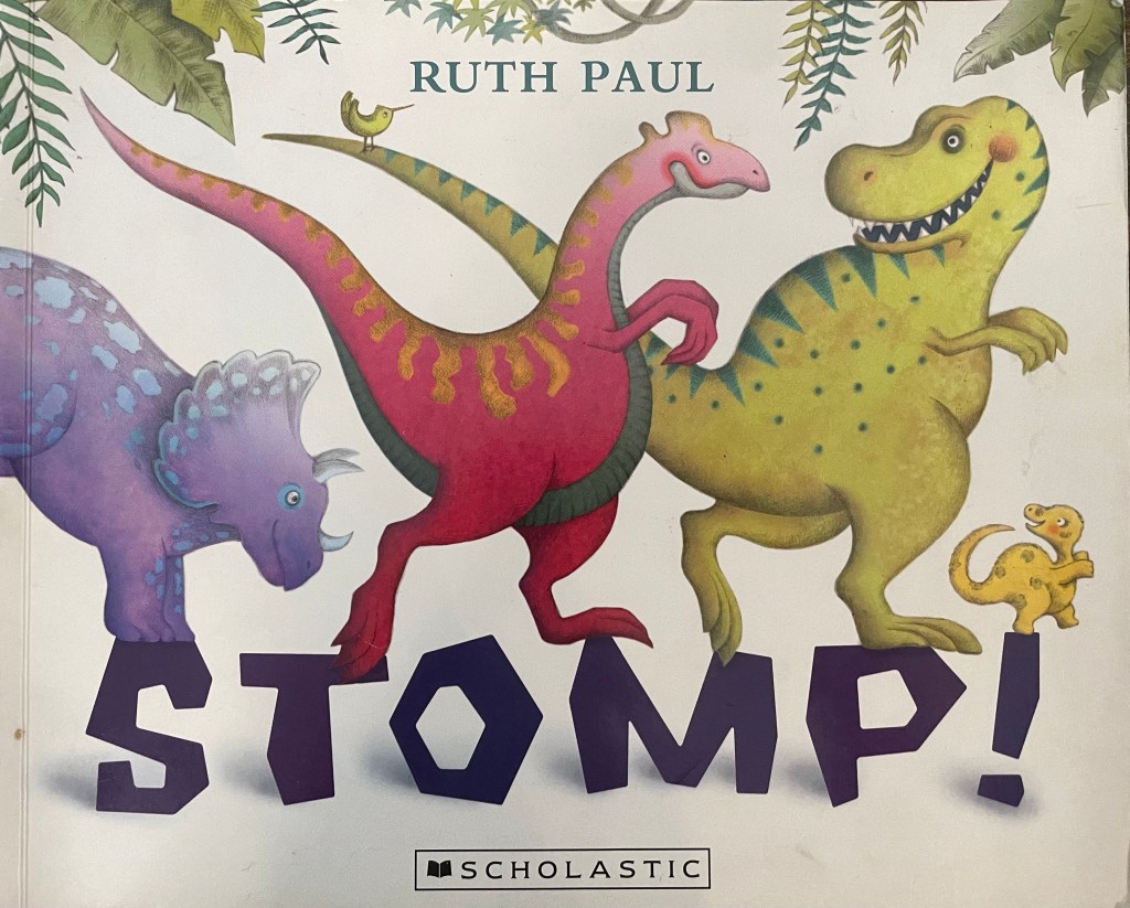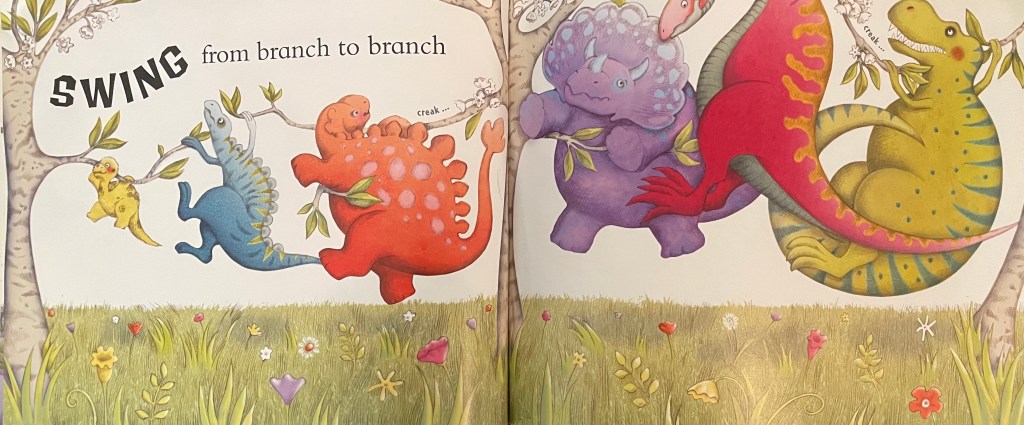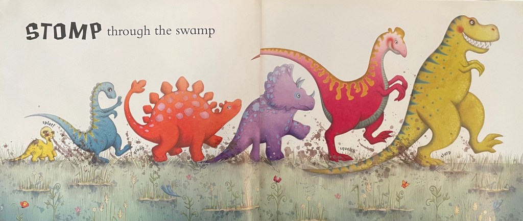 This dino book is a story about big and little dinosaurs playing a game of follow the leader. The big dinosaur is the leader first, taking them through tough terrain where the little dinosaur struggles to keep up, but still tries. Then it’s the little dinosaur’s turn to be the leader and he leads the dinosaurs through tasks that are hard for the big dinosaur to do. It’s a silly story as just a story, but it also has a solid message that we may not all be good at the same things, but we can excel in our own ways. Plus, who doesn’t love a book with fun sounds throughout!